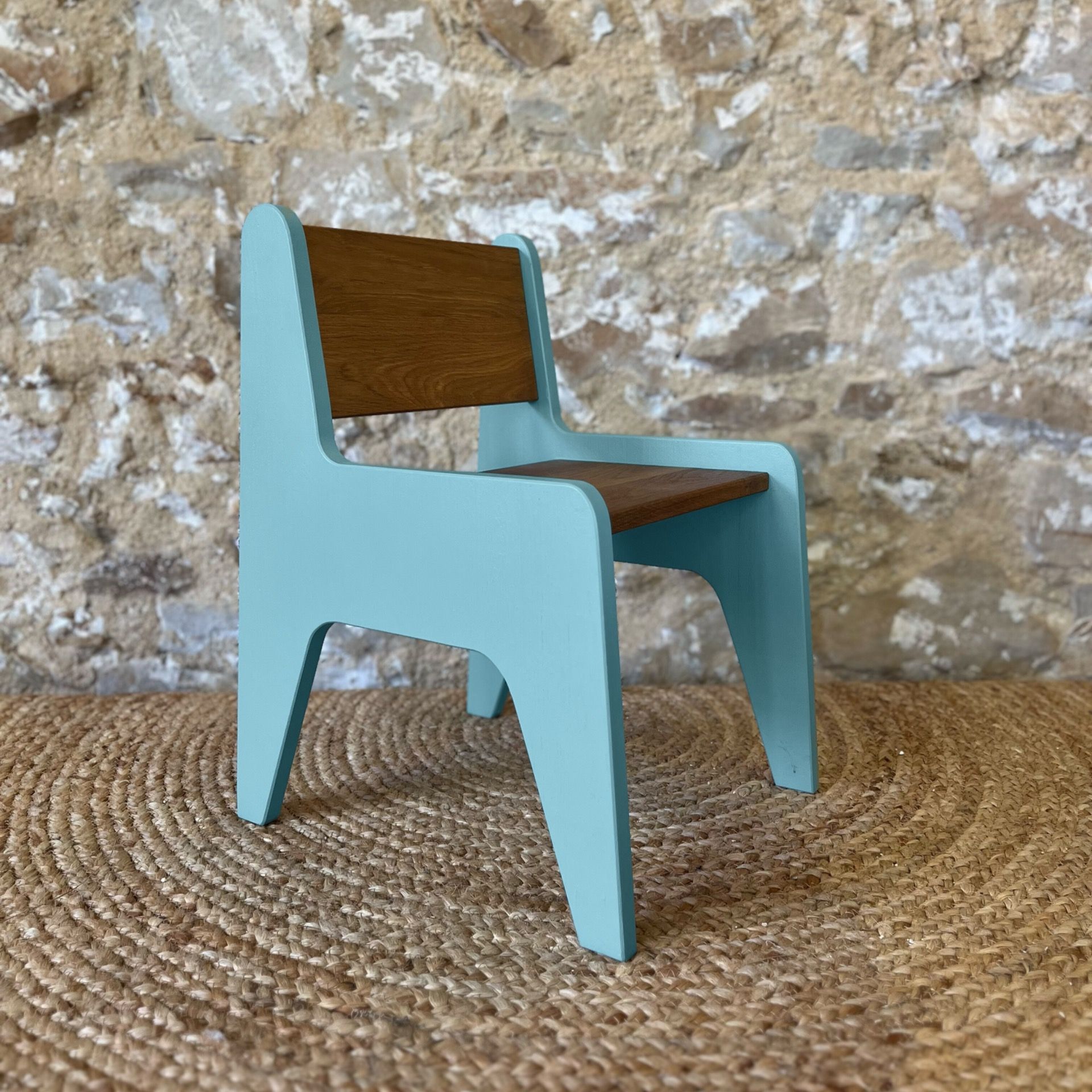 Chaise pour enfant en chêne massif issu de parquets parisiens valorisés, finitions écologiques: huile et peinture biosourcée. Ce produit peut être associé au bureau proposé dans la boutique